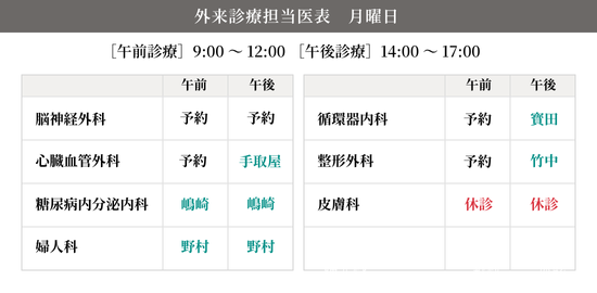 診療時間 | 月 | 火 | 水 | 木 | 金 | 土 | 日/祝 |