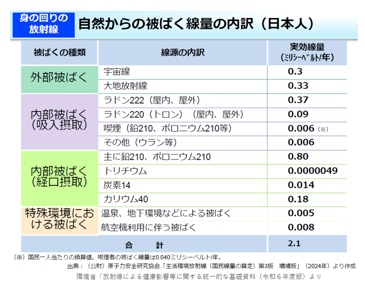 以上4種類の自然放射線を説明ました。宇宙線と地殻線(大地放射線)は外部被曝で、吸入摂取や経口摂取で体内に取り込まれた放射性同位元素からの被曝は内部被曝に分類されます。日本では1年間の自然放射線の被曝量は実効線量で約2.1mSvだとされています。その内訳を表で示します。
