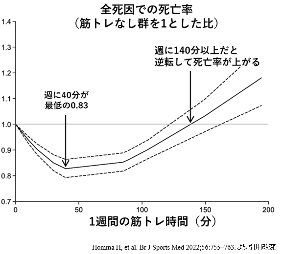 ・筋トレという刺激が加わることで何もしない人と比べて死亡率が下がり、1週間に40分程度が最も効果が高く死亡率が17%低下しています。しかし、やり過ぎると効果がなくなり(140分でやっていない人と同じ)、それ以上筋トレをすると逆転して死亡率が高くなっています。