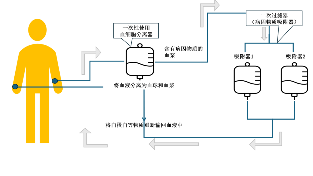2.接着、将含有LDL胆固醇等高分子病因物质的血浆送入二次过滤器。在二次过滤器中、利用特殊膜对病因物质进行吸附和去除。