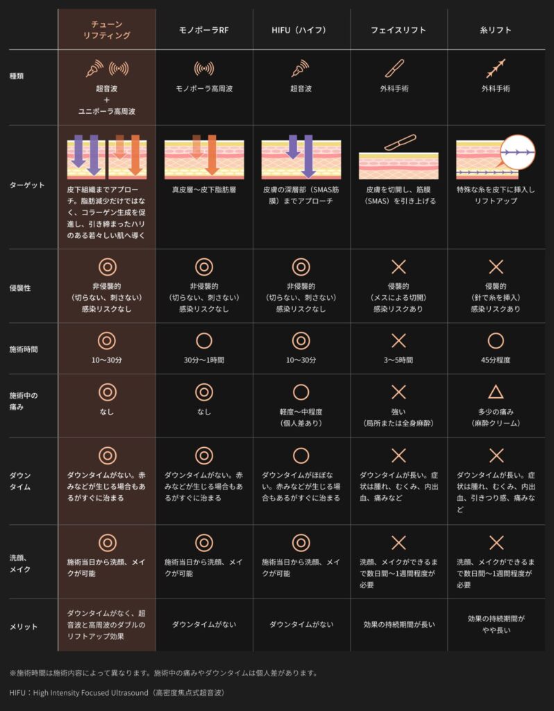皮膚の一部を切除してたるみを取り除く「フェイスリフト」や、皮膚組織に医療用の糸を通して引っ張り上げる「糸リフト」といった侵襲性の外科手術と異なり、超音波にユニポーラ高周波のテクノロジーを融合させたのがチューンリフティング。肌に傷をつけずに組織を引き締めたり、肌質を改善することが可能です。